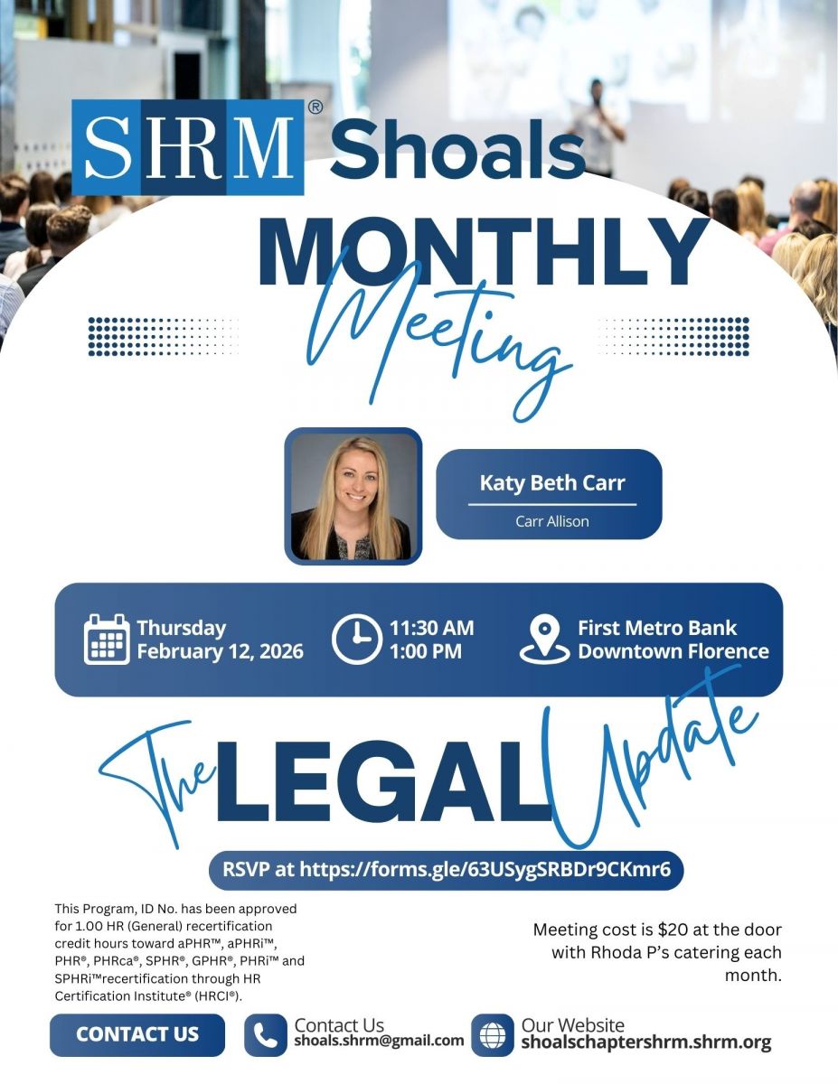 Email us at shoals.shrm@gmail.com or follow us on LinkedIn and Facebook for more information.